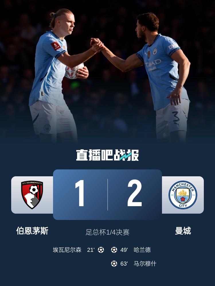 足总杯1/4决赛,曼城2-1逆转伯恩茅斯,哈兰德破门+伤退,奥赖利2助攻。