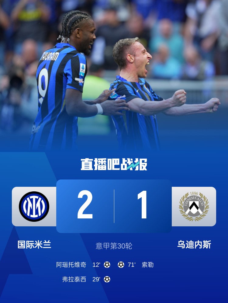 意甲第30轮,国际米兰2-1乌迪内斯,阿瑙托维奇、弗拉泰西破门,索默神扑。