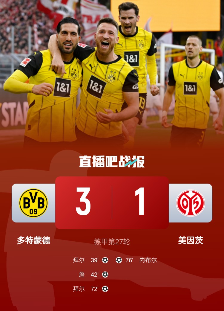 德甲第27轮,多特3-1美因茨,拜耳梅开二度,詹破门。