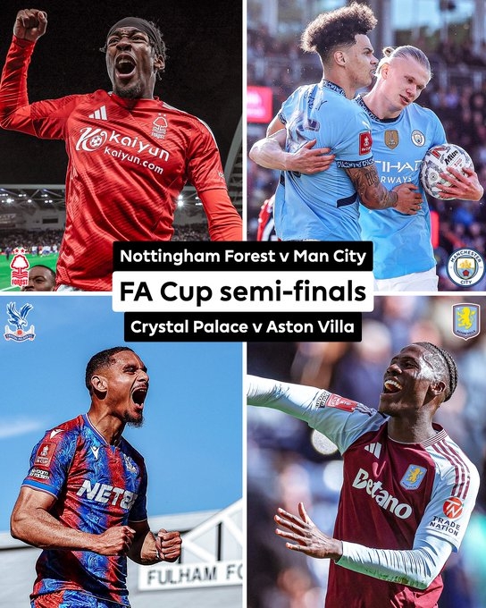 足总杯4强对阵:曼城vs诺丁汉森林,水晶宫vs维拉。